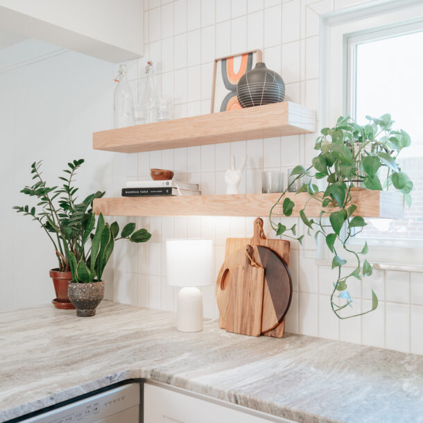 When you’re limited on space, using your walls is a great way to create extra storage. We use floating shelves for additional storage for towels and other everyday essentials. Floating shelves are also a great way to bring some additional decor into your small space!